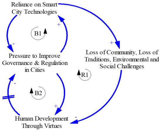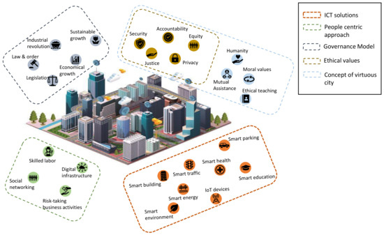 Solving the rising problems of urbanization with smart cities is by itself not adequate—humanistic principles should be at the core of all solutions. For theorizing about such humanistic principles, it serves us well to look at the philosophy of virtue and virtuous cities. Plato’s ‘The Republic’ claims that the model of an ideal city provides happiness and the ultimate human perfection [39]. Al-Farabi’s philosophy becomes very relevant for advancing democratic reforms and harmony in the city [40]. The study of the political philosophy of Al-Farabi, the medieval Muslim philosopher, especially his teachings on the need for mutual assistance between people, his focus on the intellectual and moral perfection of man and society, his social and ethical teachings, are central to the idea of a virtuous city. https://maypoleofwisdom.com/al-farabi-chasing-the-objectivity/ (accessed date: 20 October 2021). The virtues highlighted by Al-Farabi have two dimensions: ethical and intellectual. For ethical virtues, he considered justice, generosity, temperance, and courage; whereas, for the intellectual, he stressed intelligence, wisdom, and wit. The basic principle of Al-Farabi’s virtuous city is justice. The dominance of justice unites multifarious and heterogeneous elements of the city as a whole [41]. According to him, virtue is the best moral quality. The making of the smart city should reflect on the virtues to restore values among people that would be lost if the smart city only focuses on technological advancement in the city. Shannon Vallor in ‘Technology and the Virtues’ presents vast resources to embrace ethics in challenges and development practices of technology. She puts forward solutions such as “improved technomoral education”, “cultivating technomoral humility” or cultivating “renewed technomoral courage” [42]. She lists twelve virtues relevant to the contemporary human condition with sociotechnical opacity: truthfulness, self-control, humbleness, fairness, courage, empathy, care, courtesy, flexibility, perspective, generosity, and technomoral wisdom. For each of these virtues, Vallor has strived to uncover common roots amongst the traditions of Aristotelian, Buddhist, and Confucian virtue ethics, and elucidate their relevance to emerging technologies [43].