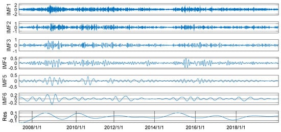 From the perspective of multi-scale methodology, the EEMD analysis affords a method to avoid the underlying time-frequency features inherent in the original signal. The EEMD analysis can decompose an original time series into different timescales. This can figure out the hidden characteristics of these returns/changes fluctuation at different timescales. In particular, the economic meaning of different fluctuation modes can be analyzed using the investigation of decomposed components at different timescales [].