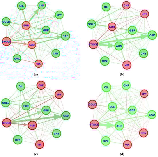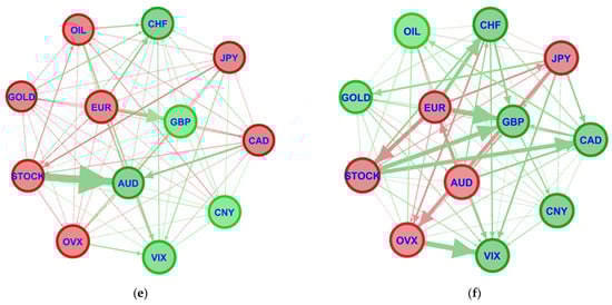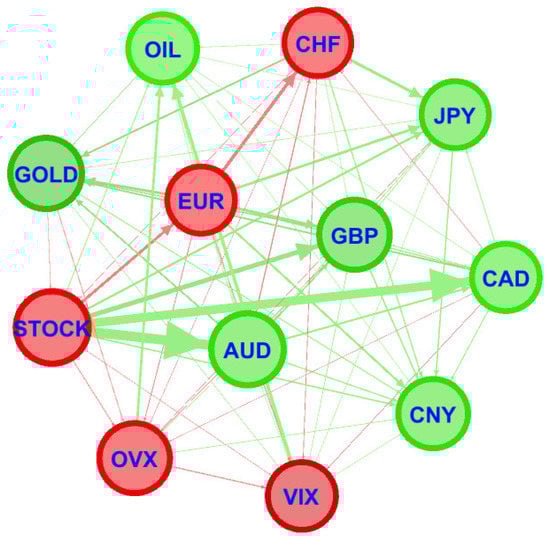 Figure 2 presents the system-wide connectedness network based on the return spillover index data in Table 8. The red (green) color of a node represents the net transmitter (recipient) of connectedness (i.e., the difference between and other series). The thickness of the lines and colors indicate the magnitude of the pairwise connectedness, while arrows identify the direction of net spillover. Figure 2 shows the main role played by the global stock market as a net transmitter of return connectedness, and the strong impact it has, on average, on the AUD, CAD, GBP, and, to a lesser extent, the EUR and JPY. The central role that the EUR plays within the network, again on average, is also shown in Figure 2, with it being a net transmitter of connectedness to gold, oil, the GBP, JPY, and CHF. The latter also plays a net transmitter role, especially with respect to the JPY. Although identified as net transmitters of connectedness, the magnitude of signals from the OVX and VIX is identified as being small.