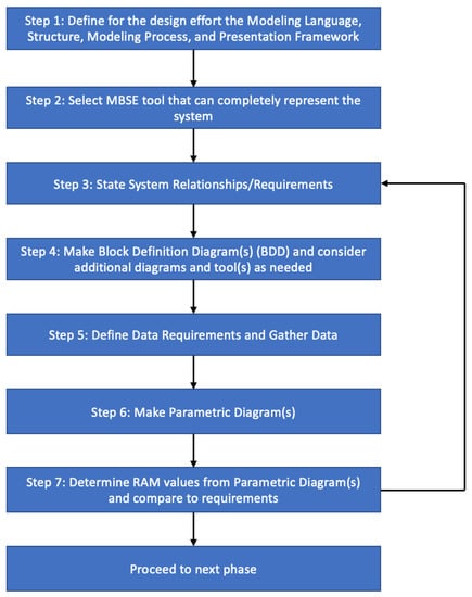 The first step for the successful integration of RAM and MBSE is to first define the modeling language, structure, modeling process, and presentation framework. There are several modeling languages to choose from, such as SysML, OPM, or UML [68]. The structure defines the elements’ attributes and relationships within the model and their connections and interactions to establish model concordance [60]. The modeling process provides the analytical framework required to run and evaluate the models. There is a plethora of models that can be used, so proper selection of the model early to inform the rest of the design effort is critical. Lastly, the presentation framework is intended to provide standard views, descriptions, and representations of the model to be presented to stakeholders in a logical manner.