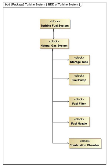 The BDD in Figure 3 shows the connections between the elements, components, systems, and subsystems within the fuel turbine system.