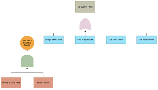 In the fault tree, at the bottom level, the light red boxes indicate the possible failures for the orange parent failure, connected by a greenish-gray AND gate. The light blue box indicates other possible failures for the fuel system denoted by the gray box, connected by the purple OR gate.