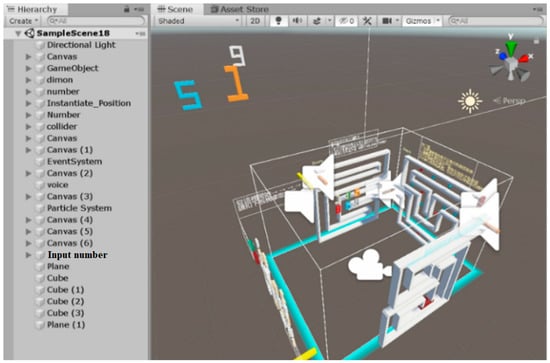 There are different types of VR devices on the market. This study used HTC VIVE for the PC-based VR and HTC VIVE Focus Plus for all-in-one VR. To develop VR software on a computer, it is required to download Steam VR and connect the VR devices to the computer. To use Unity3D for VR development, it is necessary to download two plug-ins, i.e., Steam VR and VIVE Input Utility for Unity3D to integrate with the VR devices. When using HTC VIVE Focus Plus, the designer must download VIVE Wave SDK instead of the above two plug-ins. Unity3D is a game engine for developing virtual scenes and 3D objects. The games developed by Unity3D can be executed on many platforms such as Android, iOS, Windows, and Wii. Unity3D has a hierarchical and integrated development environment to facilitate visual editing using detailed attribute editors and dynamic game previews. The Unity3D development environment consists of a scene view, an object hierarchy, a project area, and an inspector area as shown in Figure 1.