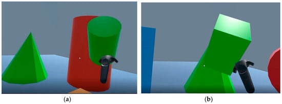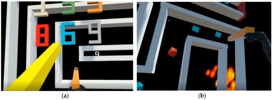 In this game, a virtual space and geometric objects with different shapes or colors are created for the player to match the correct object within a short time (Figure 3). There are four stages in this game, the first two in the same scene and the last two in another. The first and third stages are to match the shape of an object, using the colors and similar shapes as the interference. The game rule is to pick up the small object near the player and throw it at the large object of the same shape regardless of its color. The second and fourth stages are just the opposite, with the shape being used as the interference. The player needs to judge the color of an object and pick up the small object and throw it at the large object with the same color. If the judgment is correct, the player will receive ten points and the small object will disappear; otherwise, ten points will be deducted. The training time in this game takes about two minutes with 30 s in each stage. The left picture in Figure 3 shows the screen of matching the shape of the small object by throwing it at a large object with the same shape. The right picture shows the screen matching the color of the small object by throwing it at a large object of the same color.