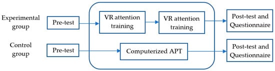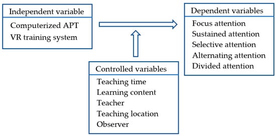A pre-test and post-test design of the quasi-experimental method was adopted in this study. The experimental group performed VR training and the control group performed the APT. Both groups took the pre-test and post-test of the “Attention scale for elementary school children” before and after the training, respectively. The experimental design is shown in Table 1, where the codes of the tests and attention training for the experimental and control groups are listed below. The independent variable, dependent variables, and controlled variables in the experiment are shown Figure 4.