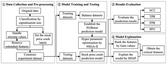 In the proposed method, many financial indicators of listed companies in the Chinese stock market are selected as the features for stock price crash prediction. Additionally, we test the effectiveness of those financial indicators for predicting a stock price crash and find the critical features for its prediction. The main procedures of the proposed method in this study are shown in Figure 2, which mainly consists of the following four components.