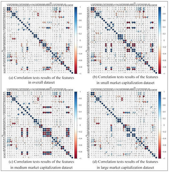 First, the following original data are derived from the CSMAR and the RESSET databases [65]: (1) weekly returns of the individual stocks and weekly market returns, which are used to calculate dummy variables measuring the occurrence of stock price crashes; (2) market capitalization data for individual stocks, which are used to divide the groups of datasets for experiments; and (3) financial indicators of the individual stocks for the listed companies, which are used as the prediction features for the stock price crash prediction model. The Pearson correlation test is then performed to remove the redundant features. Finally, the whole dataset is divided into four subsets (overall dataset, large market capitalization dataset, medium market capitalization dataset, and small market capitalization dataset). Each dataset is then divided into a training dataset and a testing dataset with a sample amount ratio of about 2:1.