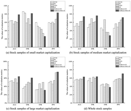 Table 4 shows a list and brief descriptions of the proposed method and benchmark methods. The benchmarks are prepared to verify whether the proposed method can perform better than other classical machine learning-based methods. Method 1 (XGBoost–NSGA-II–SHAP) is the proposed method of this research. In Method 1, XGBoost is used as a base classifier for predicting the occurrence of a stock price crash, and in the meantime, the NSGA-II is applied to optimize the hyperparameters of the XGBoost method to improve the prediction accuracy and efficiency. Moreover, the SHAP approach is adopted to explain the prediction model. Methods 2–6 are benchmark methods. Among them, the results comparison between Method 2 (XGBoost–GS) and the proposed method is used to investigate whether or not the NSGA-II can effectively improve the effectiveness of the XGBoost model as a hyperparameter optimization method when compared with grid search (GS). Method 3 adopts a random forest (RF)-based model [72], and Method 4 uses a decision tree (DT)-based model as the predictor. Both of them are classical and efficient tree models. Methods 5 and 6 adopt two classical machine learning models, which are SVM and ANN. They are employed to compare their performances with the proposed method for predicting stock price crashes.