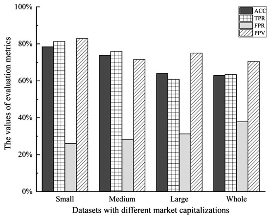 In Table 3, TP (true positive) denotes the number of positive samples that are correctly predicted by the prediction model in the testing dataset; FN (false negative) is the number of positive samples that are incorrectly predicted; FP (false positive) means the number of non-crash samples that are identified to be stock-price-crash samples; TN (true negative) denotes the number of non-crash samples that are correctly predicted in the testing dataset. For the prediction results, we employ accuracy (ACC), true positive rate (TPR), false positive rate (FPR), and positive predictive value (PPV) as the measures to evaluate the prediction accuracy and efficiency of the proposed method. Among these evaluation metrics, ACC and PPV are metrics to evaluate the model’s predictive accuracy, and TPR and FPR are metrics to evaluate the model’s predictive efficiency. Those four evaluation measures are explained and calculated as follows: