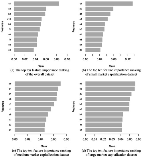 For the proposed XGBoost–NSGA-II method that is applied to stock price crash prediction, Gain values are calculated for each financial feature based on their contribution during the model-training step of XGBoost. As shown in Equation (10), the Gain represents the fractional contribution of each feature to the XGBoost–NSGA-II model based on the total gain of that feature’s splits. A higher percentage of the Gain value suggests a more important feature for stock price prediction. Therefore, the importance of the features in the input datasets are ranked by their Gain values to select the critical features for predicting stock price crashes.