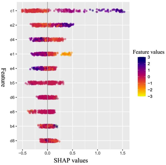 The SHapley Additive exPlanations (SHAP) method is used as a framework for interpreting the predictions of machine learning models, and it is derived from the theory of cooperative games (Shapley value) [63]. The Shapley value is based on the contributions of each player to a collaborative game, and it is used to allocate the costs and benefits of the alliance [64]. Lundberg and Lee applied this cooperative game theory to feature attributions in 2017 [49,50] and proposed the SHAP approach. In cooperative game theory, the Shapley value measures the value of each player’s contributions to the collaborative game. In contrast, for the output of a classification or regression model, the individual features become participants in the model’s outcome. Therefore, each feature will have a SHAP value generated by considering each feature’s contribution as its feature importance. Moreover, each SHAP value must satisfy the following three properties: