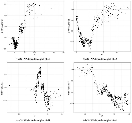 Figure 8 represents the SHAP dependence plots of the top four critical features (c1, e2, d4, and e1) for stock price crash prediction in the small-capitalization samples. They reflect the SHAP values of all corresponding samples for those features, from which it is possible to analyze how the SHAP value of each feature changes as the feature value changes. The vertical axis of each subplot in Figure 8 represents the SHAP values for the stock samples, and the horizontal axis represents the feature value. First, when the feature value of c1 (total assets growth rate) gradually became larger from the negative values, its SHAP value was gradually decreased, indicating that as the feature value of c1 gradually rose, the possibility of a stock price crash gradually decreased until the feature value increased to near zero. As the feature value continued to increase, the SHAP value gradually increased, indicating that when the value of c1 was greater than zero, the larger the feature value of c1, the higher possibility of a stock price crash. The possibility of a stock price crash decreased as e2 (cash to assets ratio) grew from 0% to approximately 18%, while the possibility of stock price crash became greater as the feature value of e2 increased from about 18% to 80%. For d4 (gross profit margin ratio), the possibility of a stock price crash gradually increased as its feature value gradually increased from a negative value to approximately 25%, while the stock price crash possibility gradually decreased as the feature value of d4 continued to increase from about 25% to approximately 100%. Furthermore, as e1 (current assets to total assets ratio) gradually increased from 0% to about 100%, the stock price crash possibility continuously decreased. By analyzing the relationship between the feature values of the above four critical features and their SHAP values, we could determine the specific influence of changes in feature values on the prediction results. The results could therefore be utilized to interpret the proposed prediction model, thus improving the interpretability of the proposed model.