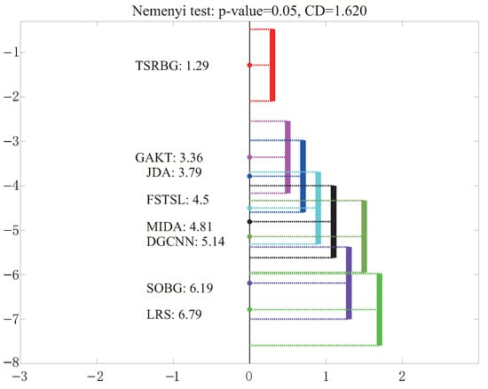 In order to describe the recognition performance advantages of our proposed model in more detail, we use the Friedman test [] to judge whether the eight models have the same performance in cross-subject EEG emotion state recognition tasks. The underlying assumption is that “the performance of all models is the same”. We rank the performance of the compared models in each group of cross-subject emotion state recognition experiments (in our experiment, the higher the recognition accuracy, the higher the ranking), and calculate the average ranking of each model. Assuming that there are K models and N data sets, we calculate the variable as