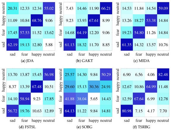 Though EEG could objectively and accurately describe the emotional state of subjects, EEG is typically weak and nonstationary. Therefore, EEG data collected from different subjects under the same emotional state might have considerable discrepancies due to the distinction of individual physiology and psychology [], leading to the poor performance of traditional machine learning methods in cross-subject EEG emotion recognition. To solve this problem, the concept of Transfer Learning is introduced to reduce the differences between cross-subject EEG data, and to improve the universality of affective brain–computer interface system [,]. Its basic idea is to use the knowledge of auxiliary domain to facilitate the emotion recognition task of the target domain. The feature transformation-based transfer learning method is the most widely one among the existing models, which aims to project the features of the source and target domain data into a subspace where the between-domain data distribution difference is minimized. Zheng et al. early on proposed to build personalized EEG-based emotion recognition using transfer learning and in [], both knowledge transfer by both feature transformation and model parameters sharing were tested for cross-subject emotion recognition. Zhou et al. proposed a novel transfer learning framework with Prototypical Representation-based Pairwise Learning to characterize EEG data with prototypical representations. The characterized prototypical representations are evident with a high feature concentration within one single emotion category and a high feature separability across different emotion categories. They finally formulated the EEG-based emotion recognition task as pairwise learning []. Bahador et al. proposed to extract spectral features from the collected 10-channel EEG data through a pre-trained network to quantify the direct influence among channels. The spectral-phase information of EEG data was encoded into a bi-dimensional map, which is further used to perform knowledge transfer by characterizing the propagation patterns from one channel to the others [].