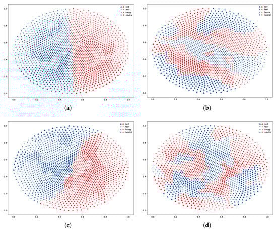 Source and target data distributions. (a) Original space of session2 subject8; (b) subspace of session2 subject8; (c) original space of session3 subject12; (d) subspace of session3 subject12.