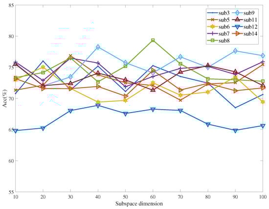 The subspace feature dimension is p. In order to obtain the subspace dimension suitable for data distribution alignment, we show the change of model recognition accuracy with the adjustment of subspace dimension in Figure 5. It is observed that TSRBG is generally insensitive to the subspace dimension. When the subspace dimension is adjusted within the interval [30, 60], TSRBG generally have satisfactory recognition accuracies.