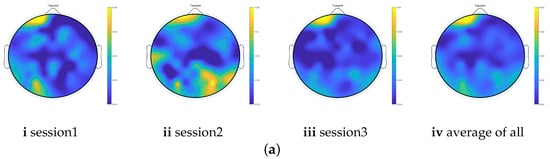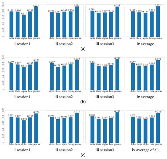 As shown in Figure 7, we quantify the importance of different EEG frequency bands in cross-subject emotion recognition, according to the above analysis. Figure 7a presents the results obtained by analyzing the source projection matrix in three sessions, respectively, and their average results. Figure 7b displays the results obtained by analyzing the target projection matrix in three sessions, and their average result. Figure 7c presents the average results of the source and target domains in three sessions, and the average results of both across all sessions. From the perspective of data-driven and pattern recognition, it is believe that the Gamma frequency band is the most important one in the cross-subject EEG emotion recognition.
