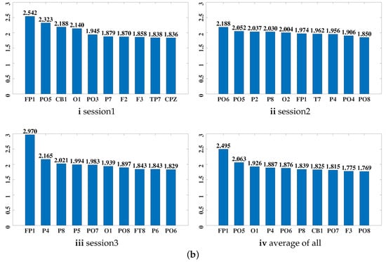 Furthermore, we calculated the importance of different EEG channels, as shown in Figure 8. In Figure 8a, we showed the importance of each brain region in the form of the brain topographic map. We observed that the position of the left side of the prefrontal lobe had high weight in all results, and believe that this brain region should have higher importance in cross-subject EEG emotion recognition. The top 10 important channels of each session and the overall average are quantitatively analyzed in Figure 8b. We believe that FP1, P06, P05, O1, P4, and P8 are more important for the cross-subject EEG emotion recognition. Considering that the model has good performance for sadness and neutral EEG emotional states, the above brain region and channels might be more closely related to these two emotional states.