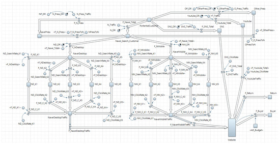 For Naver desktop advertising, we classified the traffic of each keyword and conducted the modeling so that users move to Company A’s website through monthly click rate and monthly cost-per-click. Stocks, dynamic variables, parameters, and flows used in the simulation are reported in Table 4. Potential customers entering through Naver desktop click on the advertisements through keyword search. ND_SearchRate_Ki (i = 1, 2, 3, 4, and 5) refers to monthly data for traffic classification by keyword. ND_ClickRate_Ki (i = 1, 2, 3, 4, and 5) refers to monthly click rate data by desktop keyword of Company A on the Naver advertising system.