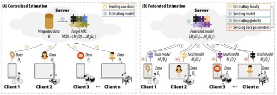 (1) Conventional centralized estimation (CE): As shown in Figure 1A, the server receives raw data uploaded by each client, and fuse them into an integrated data set . The centralized learning problem is to estimate the target MXL , where the model for each client is denoted as .