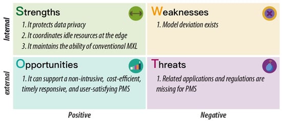 To evaluate the feasibility of FE in improving PMS, a SWOT (strengths, weaknesses, opportunities, and threats) analysis is given as shown in Figure 2. Compared to CE, FE can protect data privacy and coordinate the idle resources allocated to clients while maintaining the heterogeneity of the MXL model, thus solving the challenges faced by PMS effectively and efficiently. Even though a slight deviation between FE and CE can be observed in training the same model, it can be eliminated or remitted by the proposed FMXL (in Section 3.3). Furthermore, FE is more cost-efficient and scalable, as it can be implemented directly to support gradually growing users without acquiring the additional deployment of high-cost cloud centers to maintain a stable QoS. Finally, since FL started to be discussed only in recent years, applications and regulations about how to utilize it in the field of transportation, especially for PMS, are still missing. In conclusion, as a pioneer in learning MXL based on FL, FE can be a non-intrusive, timely responsive, cost-efficient, and user-satisfying solution for PMS.