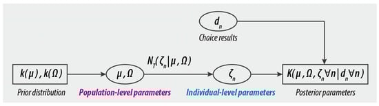 In addition, as defined in Equation (2), the observed component is typically assumed to be a linear function, in which represents a vector of an individual’s socio-demographic characteristics and other personal attributes, and represents a vector of preference parameters, which also defined as individual-level parameters.