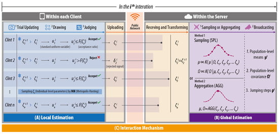 As shown in Figure 4A, in current iteration i, the conditional posterior of the individual-level parameters (), as defined in Equation (10), is sampled in each client based on the latest population-level parameters ( and ) (which are estimated and broadcasted by the server in iteration ).