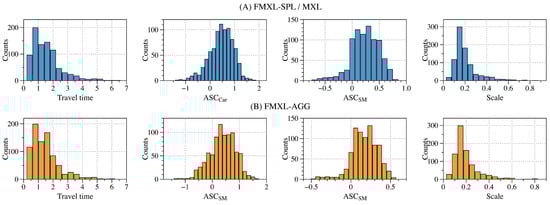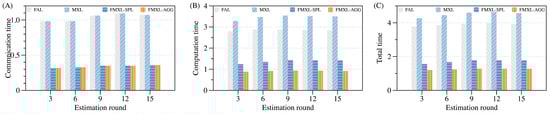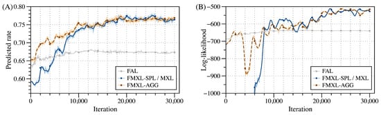 In the real-world application, where users can leave and join the service freely (similar to the dynamic estimation scenario), FMXL-AGG can be more cost-efficient than FMXL-SPL. Because, on the one hand, it is more scalable to accommodate gradually growing users as well as choice histories. On the other hand, for the initial stage of new users, it can apply the population-level parameters directly to ensure an acceptable performance even though no data is available, thus alleviating the “cold start” issue [] (as demonstrated by the first three estimation rounds in the dynamic estimation).