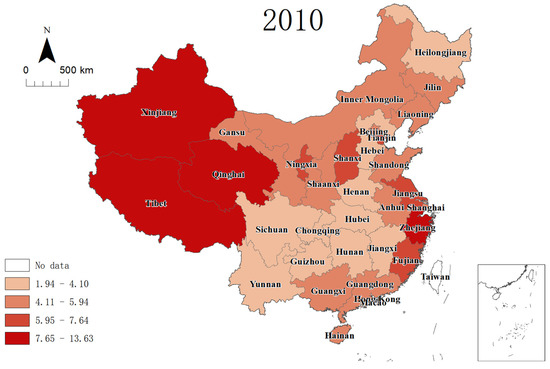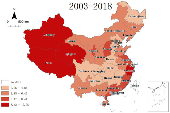 By observing Figure 4, it can be found that in 2003, the first class only included Tibet, the second class included Ningxia, Zhejiang, Qinghai, Xinjiang, Guangdong, Fujian, Beijing, Tianjin and Shanxi, and the third class included Shandong, Jiangsu, Inner Mongolia, Liaoning, Gansu, Jilin, Shanghai, Guangxi, Yunnan and Hebei. The remaining 11 provinces were in the fourth class.
