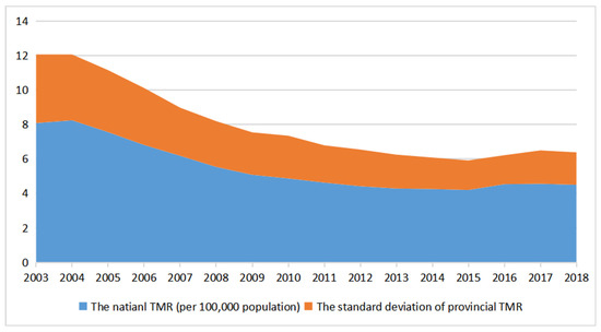 From temporal change features, the RTMR tended to change in line with road transport accidents and casualties, and obviously decreased after 2003, rebounding since 2016 (Figure 3). On the one hand, as many transport safety policies were implemented by China’s government, traffic accidents decreased year by year, and the RTRM also decreased at the same time. From another perspective, the traffic accident rescue system has improved greatly, and China has improved its financial expenditure on medical services, especially in the transportation sector, both of which factors are conducive to the sharp decline in the RTMR. The standard deviation of provincial RTMR also shows a downward trend after 2003, but a rebound since 2017, which means the regional difference in the RTMR shows a convergence trend from 2003 to 2016. In 2016–2018, the RTMRs in many provinces showed a marked deterioration compared with the previous year, which affects the national RTMR.