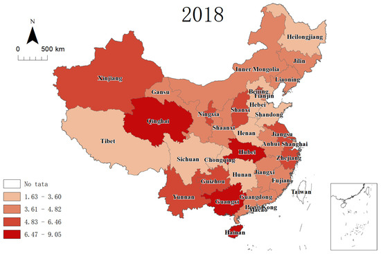 With the application of arcgis 10.2 software, the spatial distribution maps of the RTMR of China in 2003, 2010 and 2018 were made. The RTMR classifications are based on the Jenks Natural Breaks Classification Method [53]. The RTMR is divided into four grades (from high to low).