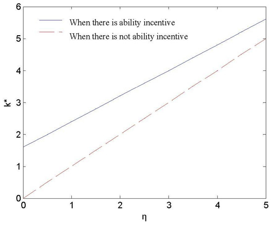 As is shown in Figure 10, when there is an ability incentive, the local government’s optimal distribution coefficient increases as the local government imposes greater supervision. In other words, when the local government provides an ability incentive for the public, the optimal effort level of the public will rise, and so does the optimal expected revenue of the local government and the public. Therefore, the local government is more willing to share partial revenue with the public to raise the enthusiasm of the public. Nevertheless, when there is no ability incentive, the local government’s supervision exerts little impact on the optimal distribution coefficient, mainly because the local government’s mission does not have a positive effect on raising the expected revenue of the public and it is unnecessary to distribute revenue. Therefore, the enthusiasm of the public decreases.