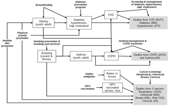 This SD model is broader in disease scope than the PRISM model, detailing the primary risk factors and development pathways not only for CVD, but also for five types of preventable cancer (namely, colorectal, breast, cervical, oral, and respiratory), as well as asthma and chronic obstructive pulmonary disease (COPD). The model contains 28 intervention levers that were designed to reflect risk reduction strategies identified in Colorado’s Chronic Disease State Plan 2018–2020 (https://cdphe.colorado.gov/chronicdisease (accessed on 1 June 2022)). These intervention levers are evidence-based strategies for the prevention, early detection, and treatment of cardiovascular disease, cancer, and chronic pulmonary disease. The long-term goal of such strategies is to reduce the burden of morbidity and mortality associated with the reference chronic disease outcomes.