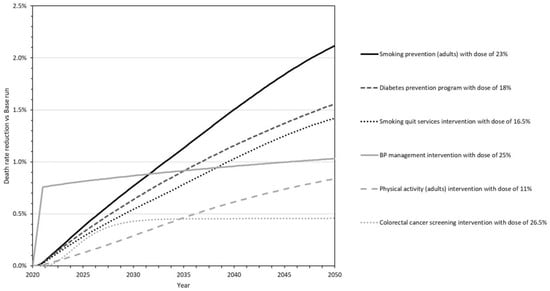 The following supporting information can be downloaded at: https://www.mdpi.com/article/10.3390/systems10040089/s1, Table S1: Simulated Combo10 death rate reduction over time relative to the base run for the six top interventions tested individually, 2020–2050 (supporting Figure 2).