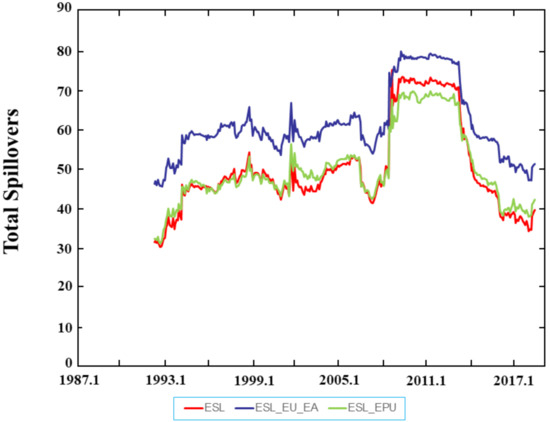 Figure 1 illustrates the dynamics of the spillovers among the economic sentiment indicators of the selected European countries (in red), between the economic sentiment indicators of the selected European countries and the EU and EA economic sentiment indicators (in blue), and between the European countries’ economic sentiment indicators and European EPU (in green). Note that all spillovers in the medium- and long-term show similar dynamics, though at different scales.