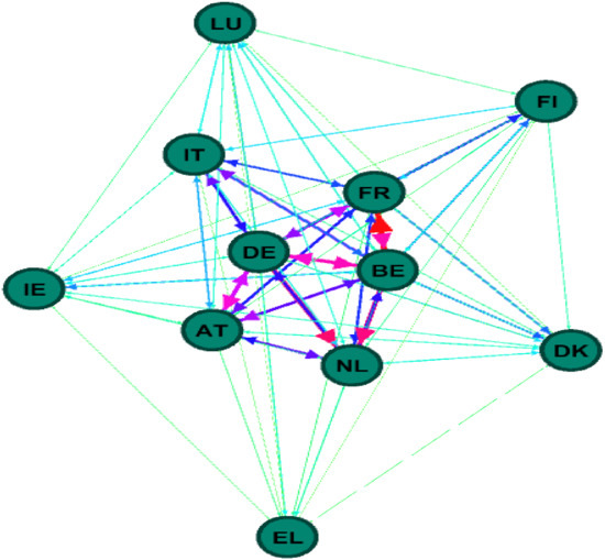 Table 2 presents the spillovers between the economic sentiment indicators of the selected European countries. We can see that the largest spillover transmitters are the economic sentiment indicators from France, Belgium, the Netherlands, Germany, and Austria. On the contrary, the smallest spillover transmitters are the economic sentiment indicators from Luxembourg, Greece, Denmark, Ireland, and Finland. The largest spillover transmitters are also the largest spillover receivers. In terms of the spillovers between pairs of economic sentiment indicators, France’s economic sentiment indicator has large spillovers on those of Belgium (11.1), Germany (8.53) and Austria (8.1). The economic sentiment indicator of Belgium has large spillovers on those of France (13.45), Germany (10.66), the Netherlands (11.82), Austria (8.95), and Italy (8.38). The economic sentiment indicator from Germany has large spillovers on those of the Netherlands (12.08), Belgium (10.98), Austria (10.54), and France (9.31). The economic sentiment indicator from the Netherlands has large spillovers on those of Belgium (7.15) and Germany (7.06). Finally, the economic sentiment indicator from Austria has large spillovers on those of Germany (9.48) and Belgium (7.74).