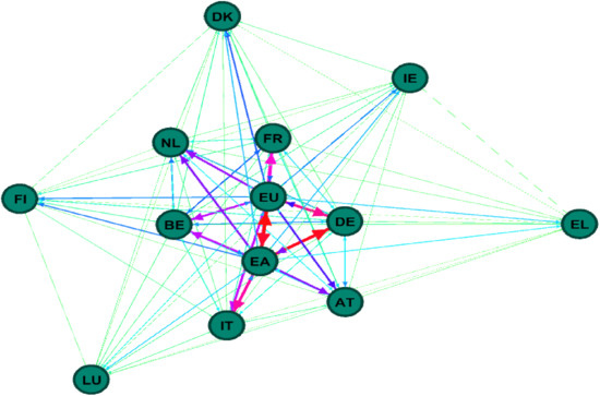 Figure 3 illustrates the system-wide network between the economic sentiment indicators of the selected European countries and the economic sentiment indicators of the EU and EA. We observe that the largest spillovers (in red) occur between the economic sentiment indicators of the whole EU and the EA. In addition, the economic sentiment indicators of the largest European economies (e.g., Germany, France, and Italy) transmit and receive large and medium-size spillovers to/from the economic sentiment indicators of the EU and EA. For instance, the economic sentiment indicator from Germany (DE) transmits and receives large spillovers to/from the economic sentiment indicators from the EU and EA. France’s economic sentiment indicator transmits and receives semi-strong spillovers to/from the EU’s economic sentiment indicator. The EU and EA economic sentiment indicators transmit medium size spillovers to the Netherlands (NL), Austria (AT) and Belgium (BE). Here again, the economic sentiment indicators of Ireland, Finland, Greece, Luxemburg, and Denmark act as small and medium-size spillover recipients of the economic sentiment indicators of the largest European economies.