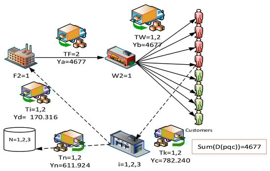 Considering the demand of 4677 for two green and non-green types of products, the same amount of product was transferred from the facility 2 with the transportation modes shown in the Figure. In addition, 170 products were recycled and saved from disposal.