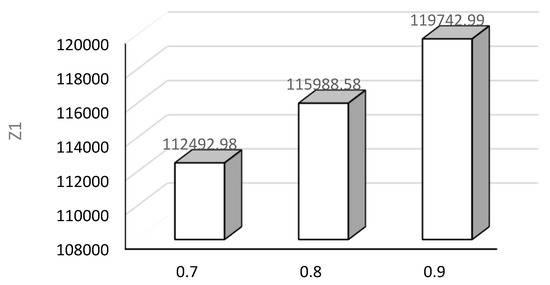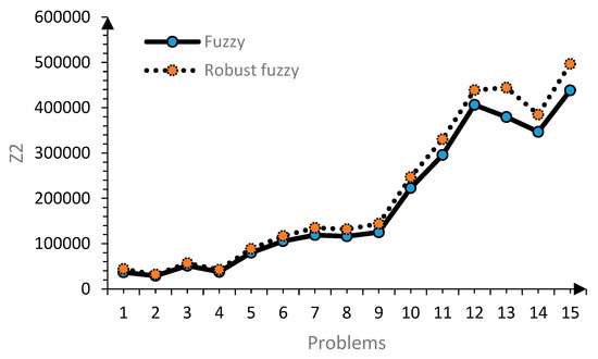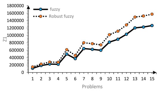 After solving various problems by the AEC method, the environmental and social responsibility objective functions were limited to an epsilon that was previously described. Table 9 presents the results. Figure 10 shows a comparison of the economic objective functions of the robust possibilistic programming and possibilistic programming models. It can be said that the value of the economic objective function of the possibilistic programming model at the confidence level of 0.9 is lower than the value of the economic objective function value of the robust possibilistic programming model with a penalty amount of 0.5 for all problems. That is, the objective function value of the possibilistic programming model at the highest confidence level is lower than the objective function value of the robust possibilistic programming model with the lowest penalty level.