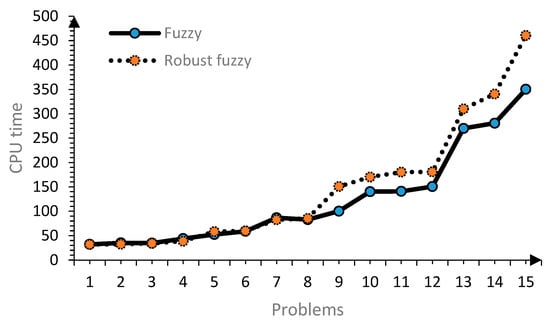 Figure 12 shows the solution time of the two methods used in this study: increasing the problem size leads to increasing the solution time. Moreover, the solution time of the robust possibilistic programming method is more than the other method.