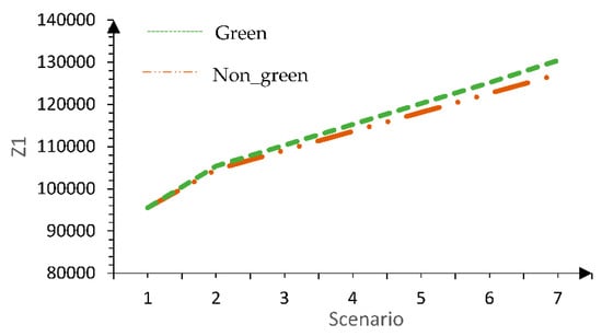Since it was assumed that there are two groups of green and non-green customers, the analysis is performed in this section on the consumption attitudes under six scenarios, each of which was solved using the AEC method. Each scenario has 20% increase in demand for green products and 20% increase in demand for non-green products. The results are presented in Table 10 and in Figure 13 and Figure 14.