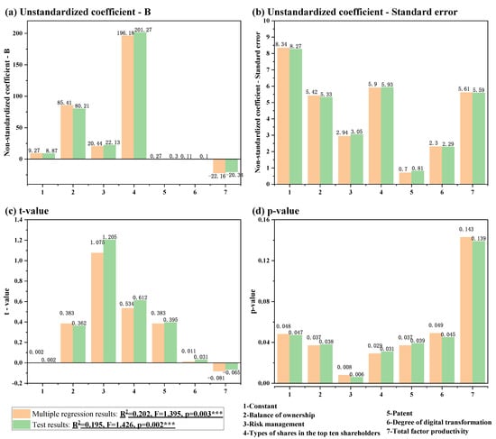 As can be seen from Figure 4, in addition to total factor productivity, the degree of equity checks and balances, risk management, the type of equity in the top ten shareholders, patents, and the degree of digital transformation have a significant impact on the green and high-quality development of enterprises (this paper considers that significant sex levels of 5% and below have a significant effect). However, there is no correlation between total factor productivity and the green and high-quality development of enterprises. From the F-value and P-value of the regression model, it can be seen that the model has a linear relationship and is significant at the 5% level. To test the robustness of the multiple linear regression model, this paper uses the explanatory value of the green and high-quality development of enterprises obtained by the principal component analysis method to replace the original explanatory value of the green and high-quality development of enterprises, and performs linear regression again for 1364 groups of sample data. The results are consistent, indicating that the linear regression model is robust. Finally, the regression results for model testing are shown in Figure 4. While performing the stability test regression, use the “F-test” to verify whether the test model has a linear relationship.