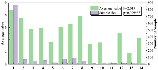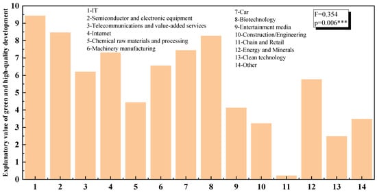 As can be seen from Table 3, the Shapiro–Wilk test was used for the explanatory value of the green and high-quality development of enterprises. The significant p value is 0.000, which is significant at the 1% level, so the data satisfies the normal distribution. According to the country’s classification of industries, my country’s industries can be divided into 28 categories at present. However, due to the lack of data or the small sample size, this paper mainly studies IT, semiconductor and electronic equipment, telecommunications and value-added services, Internet, chemical raw materials and processing, machinery manufacturing, construction/engineering, chain and retail, energy and mining, automotive, clean technology, biotechnology, entertainment media, and another 14 industries. The results of the homogeneity of variance test and analysis of variance for the industry are shown in Figure 5 and Figure 6.