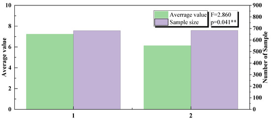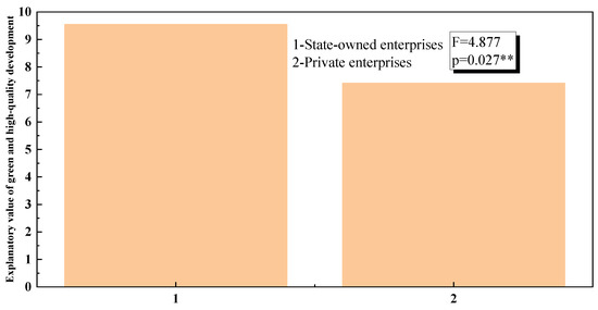As can be seen from Figure 5, the explanatory value of green and high-quality development in the IT industry is very different from other industries, followed by the semiconductor and electronic equipment and biotechnology industries, indicating that companies in high-tech and high-value-added industries are more likely to achieve green and high-quality development. In addition, the results of the homogeneity of variance test showed a significant p value of 0.006, which is significant at the 1% level. Similarly, as can be seen from Figure 6, the significant p value is 0.009, which is significant at the 1% level, indicating that different industries have significant differences in green and high-quality development. Judging from the number of investment samples in various industries, the industries with the largest number of samples are concentrated in high-tech or high-value-added industries. Similarly, the same one-way analysis of variance was performed on the equity nature of the enterprise. The equity nature of the enterprise is mainly divided into state-owned enterprises and private enterprises.