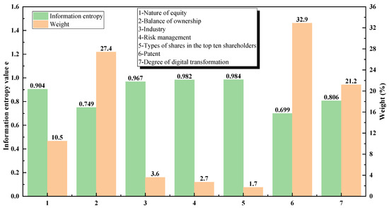 The green high-quality development evaluation index system includes a total of 5 first-level indicators, 11 second-level indicators, and 28 third-level indicators. As can be seen from the previous article, the evaluation indicators related to enterprises can be summarized into three aspects: environmental concern, environmental investment, and environmental advantages. Among them, environmental concerns mainly refer to environmental starting and pollutant discharge, and environmental investment refers more to environmental protection investment. Environmental advantages mainly include measures to reduce three wastes, energy conservation, green office, environmental certification, and environmental recognition. The data composition of the above variables is not consistent, the differences between the variables are large, and the standard deviations between the data are not in the same order of magnitude, so the CRITIC weight method cannot obtain the weight of each indicator. For this purpose, the entropy method was used to solve it.