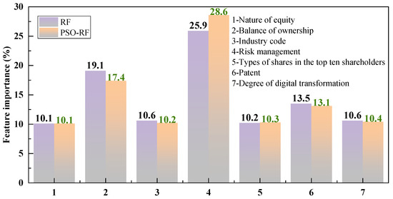 From a nonlinear perspective, it is not difficult to see that risk management has the greatest impact on the green and high-quality development of enterprises, reaching 25.9%; followed by equity checks and balances, patents, etc.; the nature of equity has the lowest impact on the green and high-quality development of enterprises, only 10.1%. It shows that from a nonlinear perspective, whether an enterprise can achieve green and high-quality development, the first thing to consider is the enterprise’s risks. An enterprise that cannot take risks and reasonably reduce risks will not be able to develop sustainably and healthily, let alone achieve green development. In addition, the next thing companies need to consider is equity integration and innovation. However, on the whole, compared with the linear perspective, the importance distribution of different influencing factors is more balanced, and the weights do not appear to be concentrated in a few variables. After comparing linear and nonlinear structures, it is not difficult to find that the importance rankings obtained by building models in different ways are quite different. However, in the two methods, the equity balance and patents are in the top three in the importance ranking, indicating that no matter whether a linear or nonlinear algorithm is used for modeling, the equity structure and innovation are both factors that enterprises need to consider if they want to achieve green and high-quality development. At this time, the number of feature variables and the number of trees in the random forest model are random, which will lead to uncertainty in the results. Therefore, the genetic algorithm was used to optimize these two values. The importance of variables in the optimized model is shown in Figure 10.