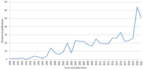 As indicated above, the sample analysed in this research comprises a total of 539 documents. The selected articles from WoS were published between 1984 and 2021. As can be seen in Figure 1, the rate of publications increased gradually from the beginning of the 1990s until 2019. This growth is common in almost any subject area, as the overall number of journals and publications has been increasing markedly in recent years [71,72]. However, in 2020 and 2021, the volume of scientific papers related to telework increased very strongly. In 2020, 64 papers were registered in WoS related to telework, which is more than twice as many as in 2019 (26 papers). In 2021, taking into account that the import of files from the WoS database took place in July of this year, 51 documents were already recorded, so it is foreseeable that the number will exceed one hundred.
