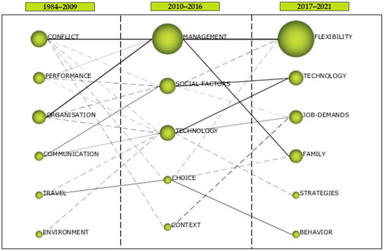 Once the evolution of the keywords is known, we set out to carry out a longitudinal analysis of telework-related research. To do this, we used longitudinal maps (Figure 3). These provided us with different perspectives on how the topics evolved in each of the periods. Firstly, we can see with which topics the first research started (Figure 3—left) and what the current trends are (Figure 3—right). On the other hand, the size of the spheres representing the clusters related to a topic provides an idea of the importance of that cluster. In our case, the size of the spheres represents the number of documents published. Finally, the evolution of the topics is symbolised by the lines connecting the different clusters. Having made this brief explanation of the procedure, we note that, from a longitudinal point of view, it can be observed that the main research contribution both quantitatively (number of documents) and qualitatively (impact of publications) is offered by the clusters related to conflict, management and labour flexibility policies (time axis Conflict–Management–Flexibility).