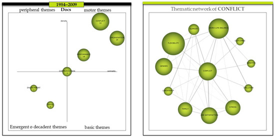 The longitudinal analysis detailed which clusters or themes were the most present in each period and what evolution they underwent. The next step was to detect the importance of each cluster for the objectives of this research. Figure 4—left shows the “Strategic Map” for the period 1984–2009. This figure shows which clusters are the main ones according to their centrality or external cohesion and their density or internal cohesion. Once this strategic map was visualized, the main themes were clearly exposed, which are those located in the upper right-hand corner of the map; these clusters are called “Driving Themes”. Figure 4—right, shows the “Thematic Network” of the driving theme of this period 1984–2009, in this case, the one corresponding to the Conflict cluster. In this thematic network, it can be seen which topics were the most investigated and what relationship there is between them. With this dynamic, two important findings were obtained: on the one hand, we detected which was the main cluster that drove research in a given period, and, on the other hand, with the thematic network, we observed which topics are related to this cluster and what link there is between them.