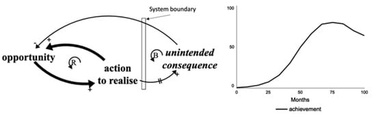 The problem version of this archetype (Figure 1) consists of a reinforcing loop intended to generate growth in an opportunity over time, but this is countered by a balancing unintended consequence loop which inhibits the growth, occurring across a boundary (physical or mental barrier) and after a delay, both of which can mask the unintended consequence. Although shown as two loops, in practice the unintended consequence loop of the archetype may subsume a number of detrimental balancing effects giving rise to a variety of behaviours over time. Figure 1 shows an example of one such behaviour.